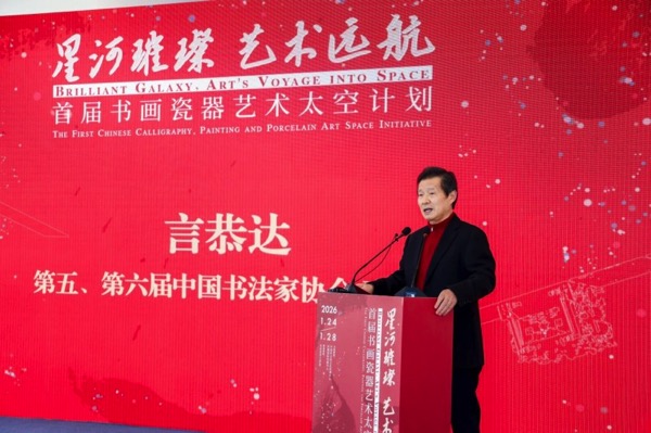 2026年1月24日,“星河璀璨,艺术远航——首届书画瓷器艺术太空计划”在北京隆重启幕。著名书法家言恭达先生携代表作《文明互鉴赋》参展,其融合古今智慧与时代精神的笔墨创作,不仅点亮地面艺术长廊,更将随中国外文局“有戏号”卫星奔赴太空,以“天地联动”的创新形式,向世界传递中华文化的包容与温度。