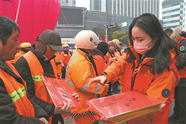 活动现场,30余名环卫工人品尝着热气腾腾的腊八粥,收到民进会员书写的“福”字。环卫工人们纷纷表示:“最近市区道路边上还有积雪没有清除,这几天大家晚上加班,早上4点半就开始清扫,虽然很辛苦,但一大早能喝上腊八粥,心里特别暖和。”
