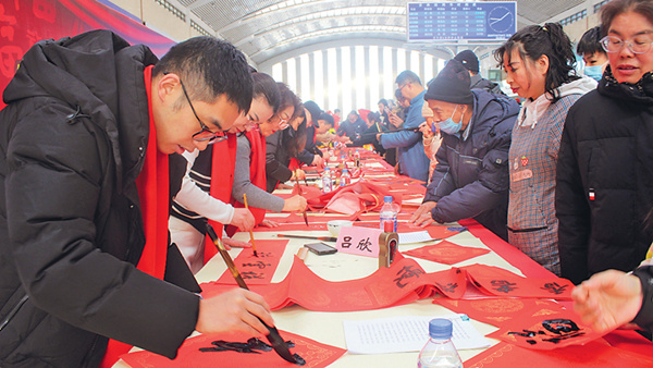 民进吉林市委会近日联合民进吉林市开明书画院、民进吉林市委会经济委员会,在吉林市火车站候车大厅开展“春联万家·策马启新”文化惠民活动。图为活动现场。