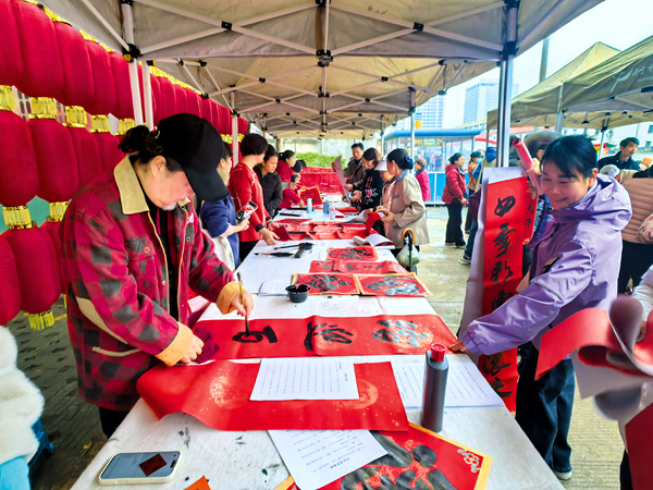 作为活动重头戏,“春联万家·策马启新”志愿服务区前一早排起长龙。中国民主促进会南宁市委员会及南宁市群众艺术馆的书法家们现场挥毫,将满载吉祥寓意的春联与“福”字送到市民手中。市民李阿姨捧着春联欣喜地说:“手写的春联才有年味,感谢书法家们把福气送到我们‘家门口’!”