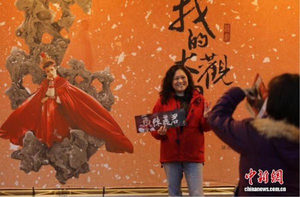 2月25日晚,《我的大观园》在台湾桃园展演中心上演,观众在海报前拍照留念。 中新社记者 刘大炜 摄