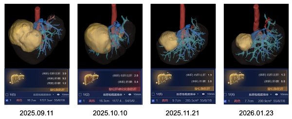 趁热打铁,团队进一步为患者量身定制了靶向+免疫的全身治疗方案。术后复查的结果,给了老杨和团队最振奋的答案:这颗肝癌“核武器”的精准打击效果显著,肿瘤体积迎来“断崖式”缩小。从2025年9月初诊时的1700cm³,到2026年1月复查时仅剩200cm³,肿瘤体积缩小至原来的八分之一,剩余肿瘤在磁共振上显示已完全坏死,失去活性;肝癌核心肿瘤标记物异常凝血酶原指数,也从5000骤降至40,各项指标均迎来质的改善。通过医院影像重建软件评估,患者肿瘤体积明显缩小。
