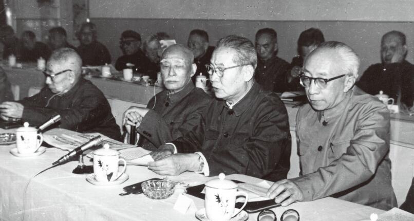 徐伯昕(右二)做题为《团结起来,为加速社会主义现代化建设贡献力量》的工作报告。