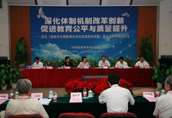 2010年7月18日,为贯彻落实全国教育工作会议和《教育规划纲要》精神,中国教育政策研究院以“深化体制机制改革创新 促进教育公平与质量提升”为主题,隆重召开了专题研讨会。会议由全国人大常委会副委员长、民进中央主席、政策院院长严隽琪,理事长、北京师范大学党委书记刘川生和校长钟秉林,全国人大常委、副院长王佐书亲自主持。全国人大常委会、全国政协、国家教育部、国家发改委、民进中央教育委员会和地方组织、安徽省政府、北京市教委、上海市教委、山东省教育厅、河北省教育厅、浙江省教育厅等部门的领导与专家,清华大学、北京师范大学、华东师范大学、中央教科所、西北师范大学、首都师范大学等高校和科研机构的专家学者,以及中小学校长教师,北师大师生等参加了专题研讨会。