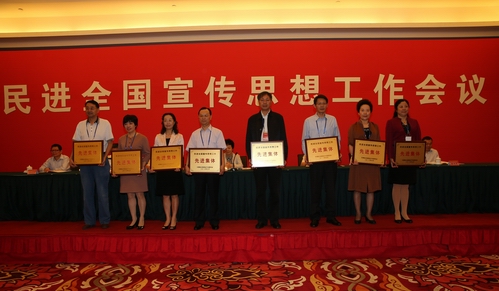 128个集体“民进全国宣传思想工作先进集体”称号,图为先进集体代表领奖。