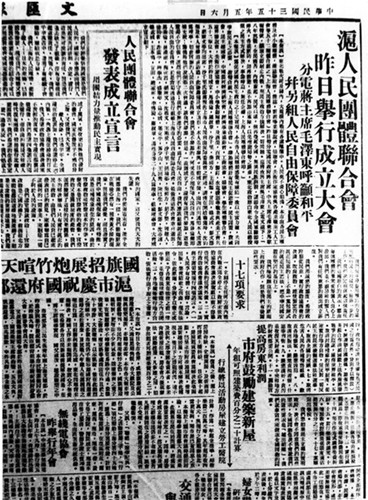 1946年5月5日,上海67个人民团体组织在中共上海地下党领导下,成立了上海人民团体联合会(简称人团联),为更大规模地开展反蒋斗争创造了条件。民进被各团体组织一致公推牵头负责这一联合机构的筹建工作,为人团联的创建做出了贡献。