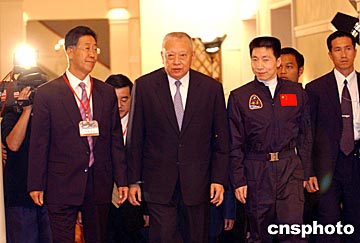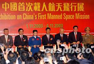 “中国首次载人航天飞行展”十一月一日在香港科学馆开幕,香港行政长官董建华、中国首飞航天员杨利伟等为该展览剪彩 |
