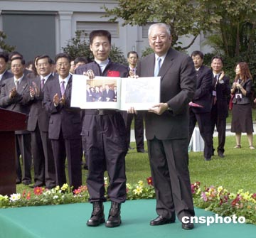 11月5日,香港特区政府为中国首次载人航天飞行代表团举行欢送仪式,特首董建华向杨利伟致送访港时的相片 | |