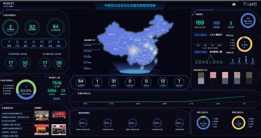通过驾驶舱大屏幕实现数据首次全息化展现,初步实现了全国各级民进组织社会服务开展情况的一屏集成、一屏掌控