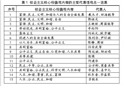 自从党的十六届六中全会提出“建设社会主义核心价值体系”以来,我国学界对于相关问题进行了广泛研究。其中,对于社会主义核心价值观的凝练成为学术界关注的焦点。如何凝练出简明扼要、通俗易懂的社会主义核心价值观是建设社会主义核心价值体系的关键。我们对近年来关于社会主义核心价值观主要观点进行了初步梳理(详后表1)。希望通过社会主义核心价值观公民认同度调查,从公民认同角度实证研究得出社会主义核心价值观的基本共识及其影响因素。