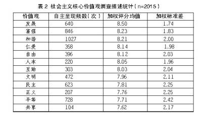 自我呈现的方式偏向于记忆印象和意识判断,而打分的方式更直接更明确地判断重要性。以打分作为考核12项核心价值观的重要性,得出核心价值观中最重要的四项是“发展”、“富强”、“和谐”、“仁爱”,其次依次是:“自由”、“人本”、“互助”、“文明”、“民主”、“正义”、“平等”、“共享”。这12项的具体得分如表2所示。因此,公众对于社会主义核心价值观的重要性认同度最高四项为“发展”、“富强”、“和谐”、“仁爱”,我们将其定义为社会主义核心价值观基本共识。
