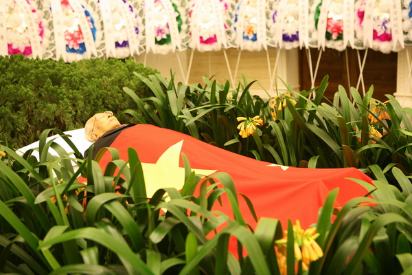 雷老的遗体安放在鲜花翠柏之中,身上覆盖着鲜红的国旗