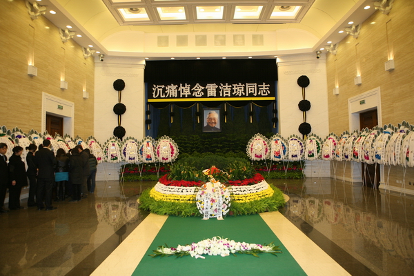 1月15日上午10时许,八宝山革命公墓大礼堂内庄严肃穆,哀乐低回。著名的社会学家、法学家、教育家,杰出的社会活动家,中国民主促进会的创始人之一和卓越领导人,中国共产党的亲密朋友,中国人民政治协商会议第六届全国委员会副主席,第七届、八届全国人民代表大会常务委员会副委员长,中国民主促进会第七届、八届、九届中央委员会主席,第十届、十一届名誉主席雷洁琼同志遗体告别仪式在这里举行。