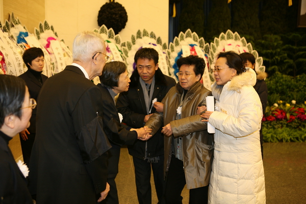 雷老的家属克制着悲痛情绪,与前来送别的民进同志一一握手。