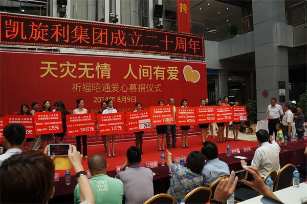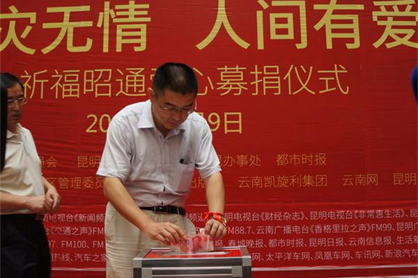 2014年8月9日,云南昭通鲁甸6.5级地震发生后的第七天,由民进云南省委、昆明慈善总会、昭通驻昆办事处主办的“天灾无情人间有爱祈福昭通爱心募捐仪式”在昆明凯旋利车博汇举行。民进企业家会员、车博会商户及员工、社会各界的爱心人士到场进行现场募捐,此次活动共募集善款1815340元。这些善款将通过昆明慈善总会全部转交昭通鲁甸地震灾区,用于民进云南省委指定的灾后学校重建。