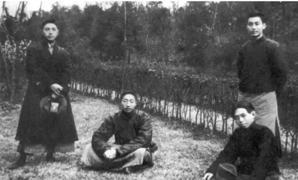 1921年3月,叶圣陶(右立者)、沈雁冰(右坐者)、沈泽民(左立者)、郑振铎(左坐者)在半淞园合影。