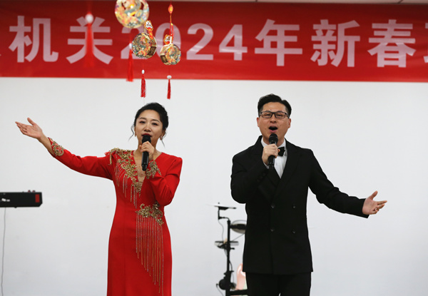 民进北京市海淀区委会青工委委员黎庆、青年歌手吕晓旺带来了合唱《开门红》。