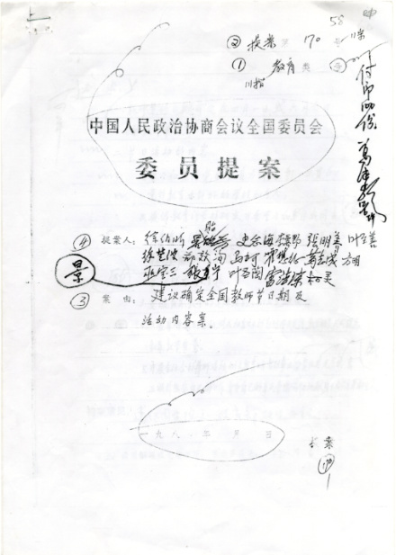 图为1981年民进17位政协委员提交全国政协五届四次会议的《建议确定全国教师节日期及活动内容案》(扫描件)。