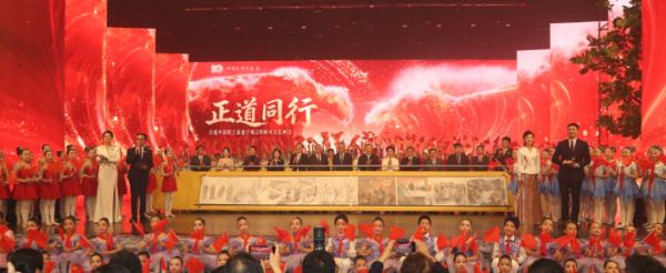 12月10日,庆祝中国民主促进会成立80周年文艺演出在全国政协礼堂隆重举行。图为民进中央领导与民进先贤后人一起开启《同行新时代》画卷。