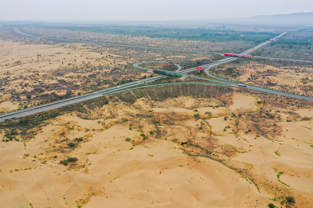 这是2020年9月22日拍摄的内蒙古鄂尔多斯杭锦旗境内的穿沙公路(无人机照片)。新华社记者连振摄